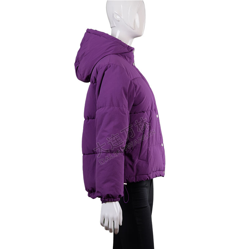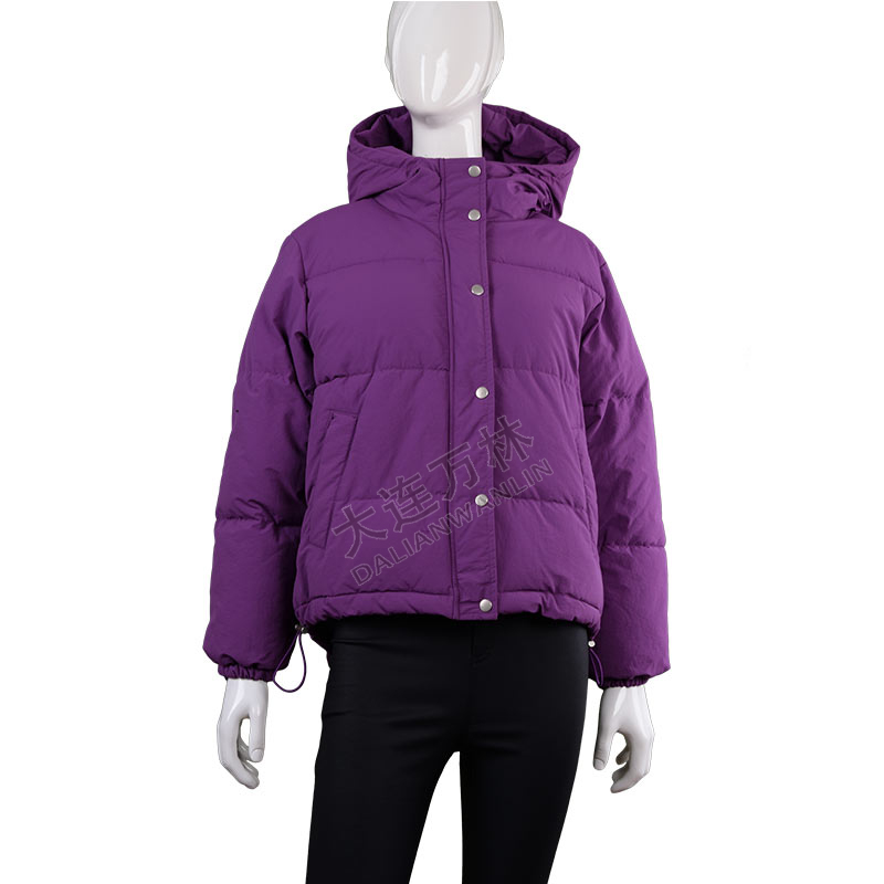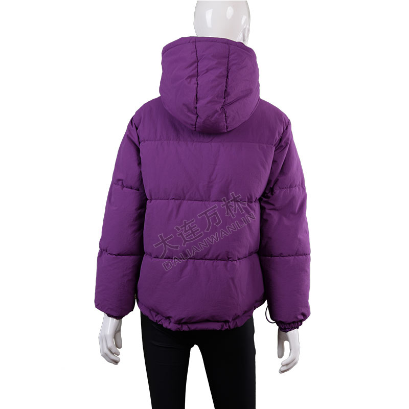 紫色短款連帽抽繩羽絨服